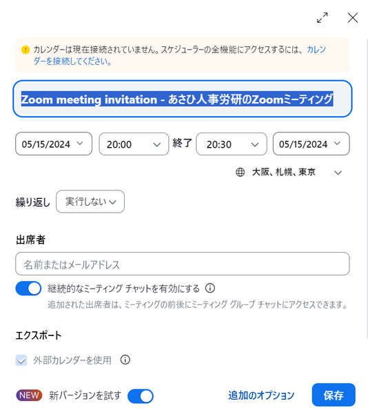 (終了時刻は長めに!)そして右下の「保存」をクリック